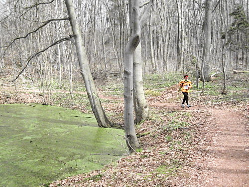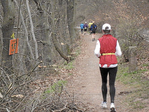 Es ging abwärts und auf der Rückseite des Berges, bis er umrundet war. Die nächsten beiden Kilometer gingen auf einem schönen Pfad weiter im Wald sanft abwärts, man musste aber sehr aufpassen, da man sonst leicht über eine Wurzel oder einen der zahllosen Steine stolpern konnte. Immer wieder ging es nun auch ordentlich aufwärts, gehen aber musste ich hier nirgends. Bei etwa km 27 (noch 15 km) stieß man auf die Halbmarathonstrecke, die ab hier bis ins Ziel identisch verlief. Die Halbmarathonis aber waren allesamt schon längst wieder im Ziel, so dass wir den Wald immer noch für uns ganz alleine hatten.