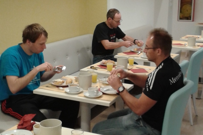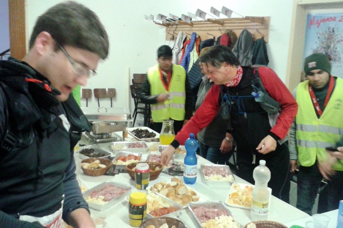 Im Hotel war man so zuvorkommend und hat uns Läufern das Frühstücksbuffet schon ab sechs Uhr zur Verfügung gestellt. Alles da, was das Herz von Reisenden begehrt, insbesondere von Läufern, die einen Ultra vor sich haben. Ich begnügte mich allerdings mit Kaffee, ein kleines Brötchen mit Wurst und eines mit Honig. Es logierten noch mehr Läufer in diesem Hotel, diese sprachen jedoch nur slowenisch. An dieser Stelle sei erwähnt, dass wir fünf die einzigen Vertreter Deutschlands bei diesem Ereignis waren. Super, dann werden wir schon mal die Nationenwertung gewinnen.