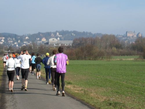 Kilometer neun war vorbei und wir liefen nun Richtung Ziel. Hier kamen uns die entgegen, die bereits die zweite Runde begonnen hatten. Elke Streicher und Jochen Höschele waren heute langsamer als üblich unterwegs, sie wollten hier einen langsameren, langen Lauf machen. Aber auch Sigrid Eichner lag schon weit vor mir. Sie war nach ihrer Operation wieder schmerzfrei und freute sich, dass sie ihre alte Form gefunden hatte. Auch Gabi Leidner eilte mit hochrotem Kopf auf ihre zweite Runde; sie lief nur den Halbmarathon, um anschließend noch genügend Zeit zum Fotografieren zu haben.