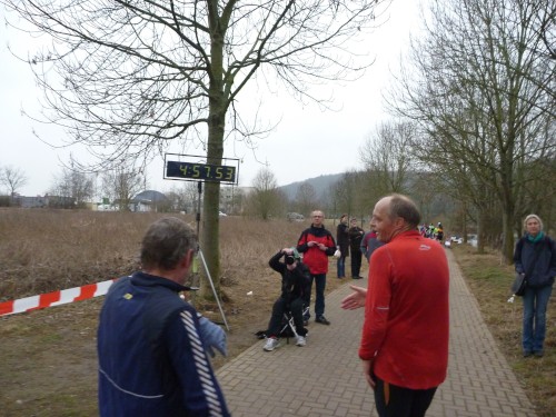 Nach der ersten Runde, als wir von der Fußgängerbrückenkonstruktion „Am Krekel“ zum Start/Zielbereich laufen, kommt die Erinnerung an  letztes Jahr hoch: Hier an der Brücke fetzte Peter Seifert an mir vorbei, sodaß mir vor Bewunderung die Cola überschwappte. Mit 2:52:26 wurde er  Deutscher Meister. Wenige Tage später fuhr  ihn ein Auto beim Training an. Er befindet sich immer noch in der Rehabilationsklinik. Gute Besserung Peter!
