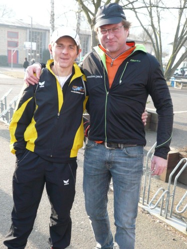 Ob Peter gut geschlafen hat, kann ich nicht sagen. Er ist heute sehr wortkarg, tänzelt rum wie ein Boxer auf den Weg zum Ring, schaut oft konzentriert auf den Boden, oder weit in Richtung der welken Felder. Aber er hat Zeit ein Foto zusammen mit mir zu machen. Hört er Musik über die Ohrhörer oder gibt ihm sein Trainer Wolfgang Olbrich noch letzte Anweisungen?