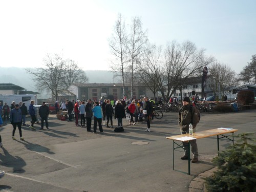 Es ist eiskalt morgens in Marburg an der Steinmühle. 35 Euro kostet die Nachmeldung, ich habe mich mal vorsichtshalber für die 50 km gemeldet.