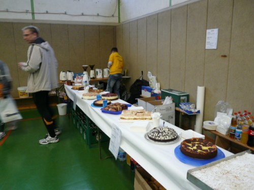 Die Abholung der Startunterlagen klappt problemlos und wenige Minuten später bin ich lauffertig. Es gibt bereits Frühstück, auch jede Menge selbstgebackener Kuchen lockt bereits jetzt schon, im Vorgriff auf das erst noch zu Leistende etwas für die Kalorienbilanz zu tun. Wie fast immer verkürzen mehr oder weniger tiefgründige Plaudereien mit netten Laufkamerad(inn)en die Wartezeit. Volker Berka ist da, Prof. Dr. Hans Drexler, alias Schneggi, sehe ich im Getümmel und mit Uli Tomaschewski vom 100 MC gibt es reichlich Diskussionsstoff.