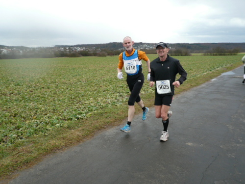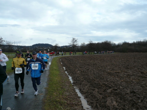 Als ich dann wieder auf das freie Feld komme und mir der Wind mit Wucht entgegenbläst, frage ich mich, wem ich eigentlich heute etwas beweisen muß. Da mir keiner antwortet, ist die Entscheidung schnell gefallen. Am Marathon-Wendepunkt mache ich kehrt und beende den Lauf nach 42,195 km in etwa 4:08 Std. Na ja, mit den jeweils 1,5 km von bzw. zur Sporthalle ist es insgesamt auch so noch ein kleiner Ultra geworden! Ich bin sicher, in punkto Gemütlichkeit hat Markus Pitz mit seiner Entscheidung für den Merkerser Kristallmarathon 550 m tief unter der Erde (warm, trocken und windfrei) die intelligentere Entscheidung getroffen.