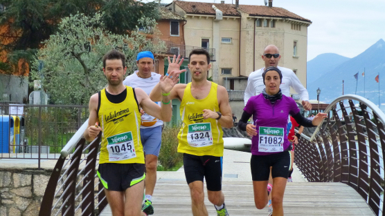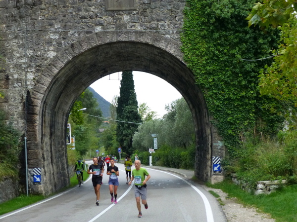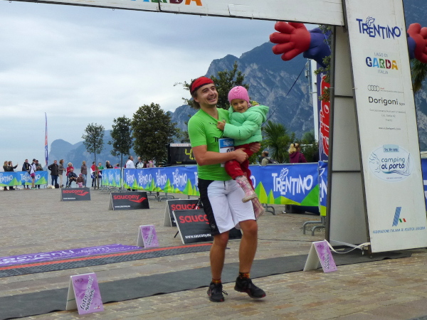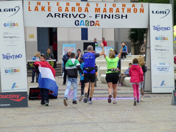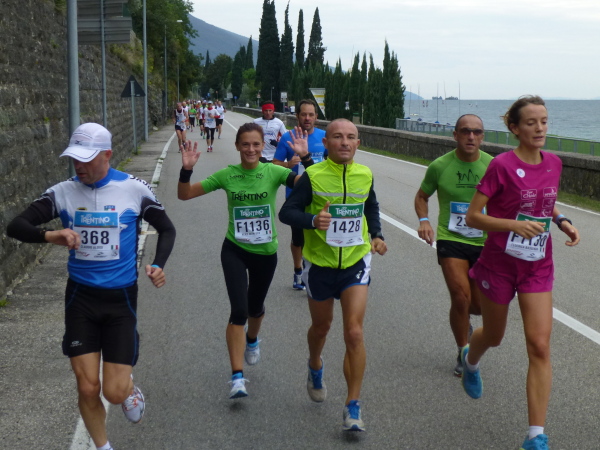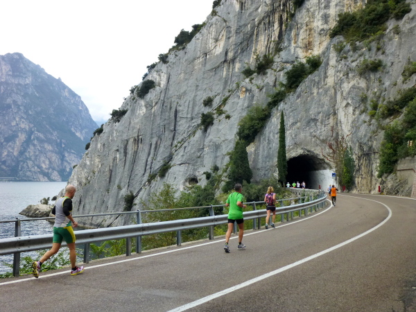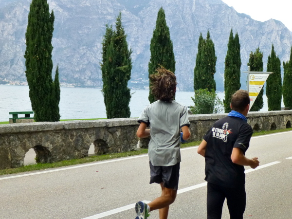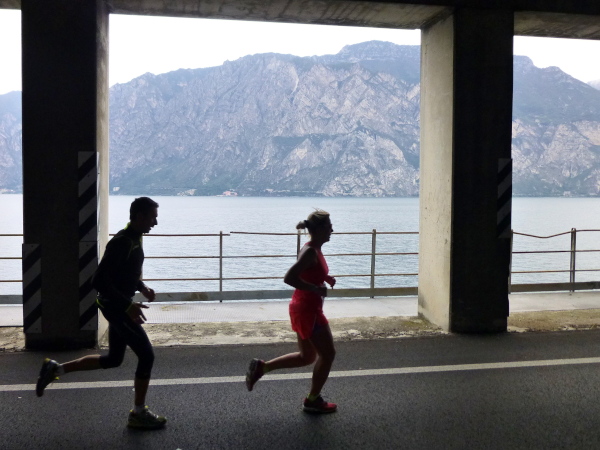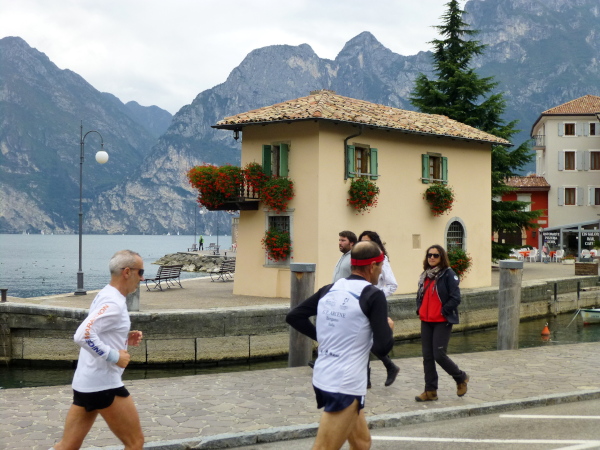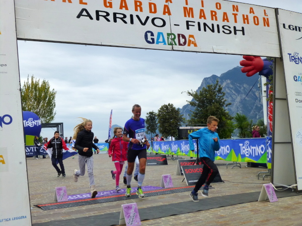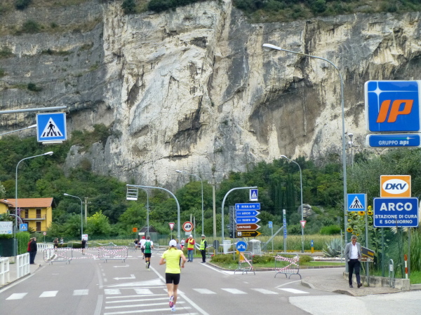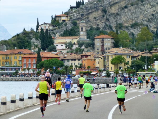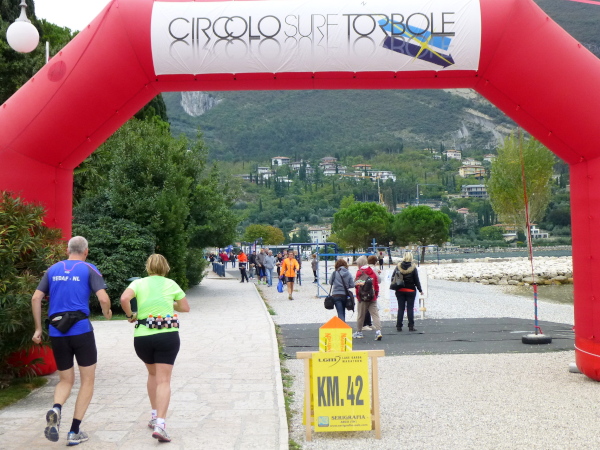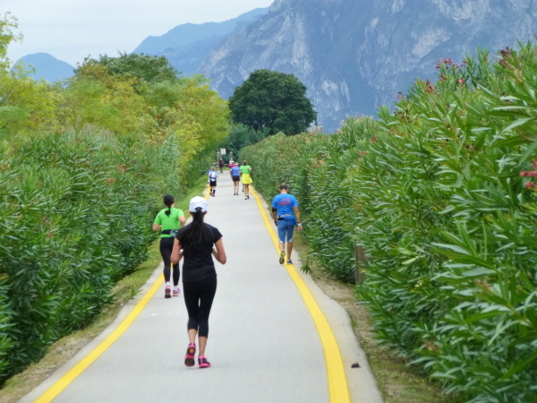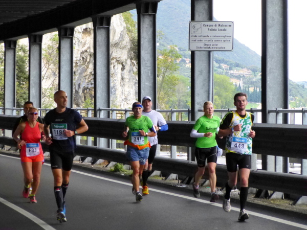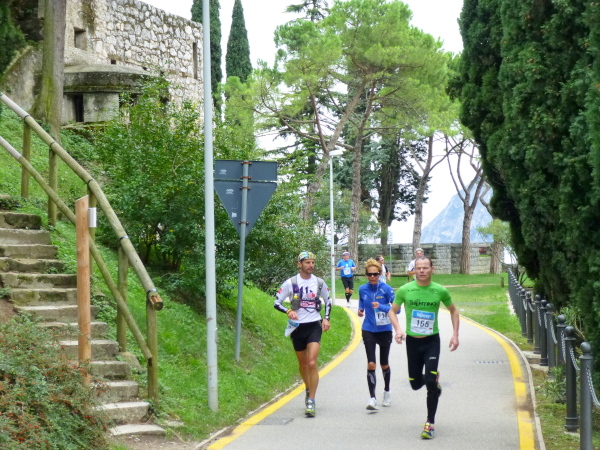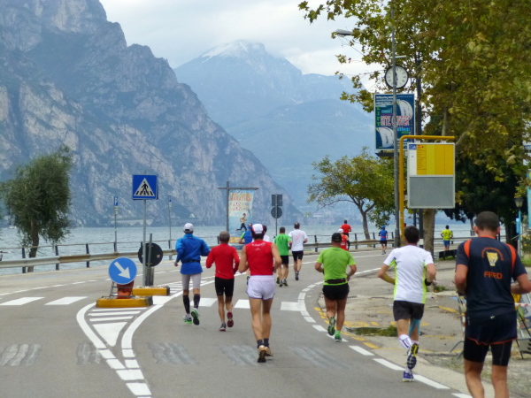 Die nahende Steilwand des Monte Brione signalisiert uns, dass Torbole nicht mehr weit ist. Eine letzte Schleife und wir finden uns auf dem breiten, hellen Kiesstrand wieder, dem wir auf dem gepflasterten Uferweg folgen. Klatschend begrüßen die dahin flanierenden Spaziergänger die eintröpfelnden Läufer und der zunehmende Lärmpegel signalisiert: Gleich ist es geschafft. Über Lautsprecher wird jeder Ankömmling begrüßt. Und dann bin auch ich schon unter ihm durch, dem Zielbogen, als einer von fast 1.700. Denn so viele sind es, die es bei der „Premiere“ in diesem Jahr auf einer der drei Distanzen bis hierher schaffen, jeder Vierte übrigens ein Marathonläufer.