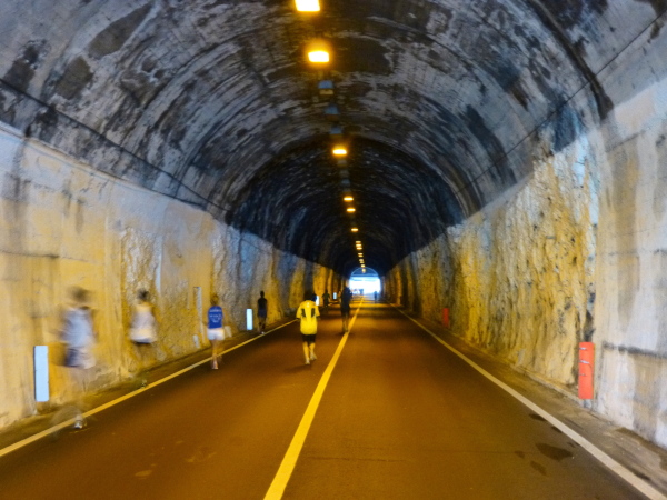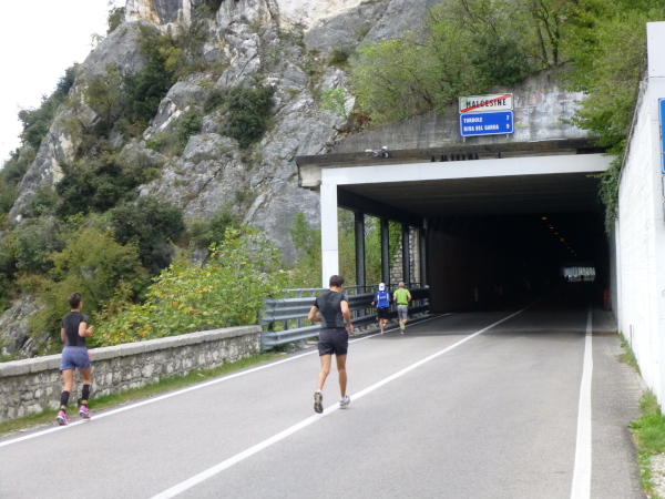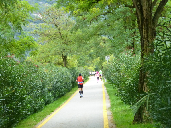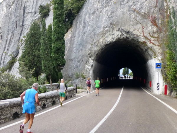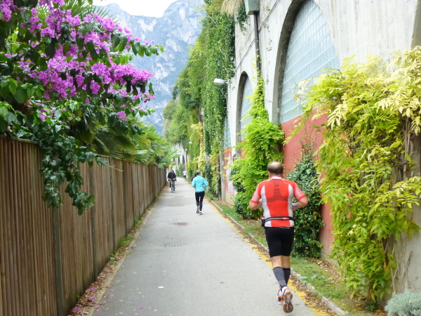 Riva – damit hätte ich nicht gerechnet. Wunderbar war der Weg bis hierher. Und gerne wäre ich noch weiter durch den Uferpark gen Ort getrabt. Aber das sieht der Streckenplan dann doch nicht vor. Vielmehr heißt es: Kehrtwendung. Auf der für Autos gesperrten Uferstraße geht es, teils durch einen Tunnel, zurück auf die andere Seite des Monte Brione.