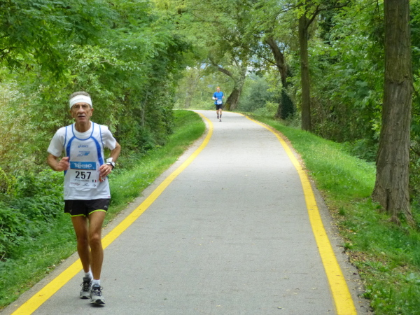 Ein längeres Päuschen an der nächsten Versorgungsstelle tut not. Alle fünf Kilometer sind sie eingerichtet. Gab es bis zur Streckenhälfte nur Wasser, so erwartet uns seitdem das „Vollprogramm“ mit Isogetränk, Bananen- und Apfelstücke und Kuchen. Das Wasser gibt es in Halbliterflaschen, verschwenderisch und wenig vorteilhaft für die Ökobilanz, aber ungemein praktisch.