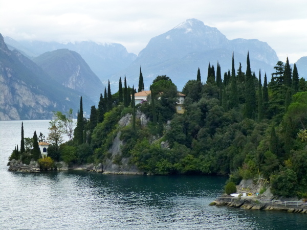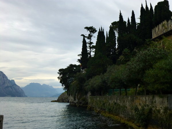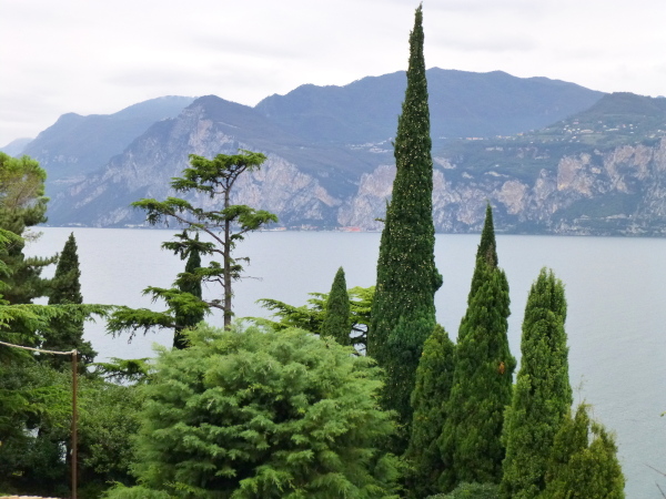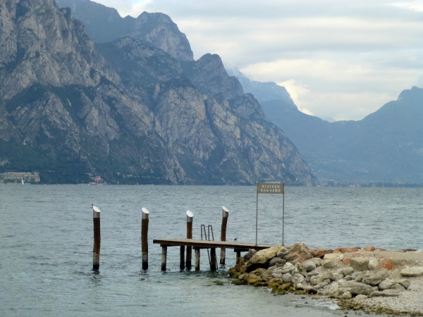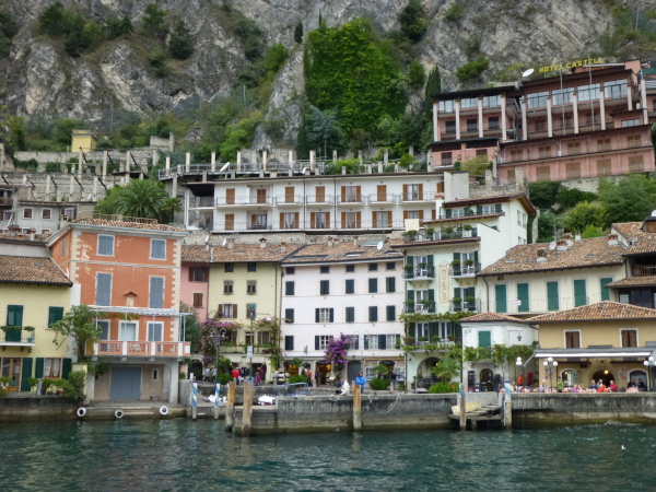 Bis zum Nachbarort Navene (km 20,5) zieht sich die touristische Einflusssphäre Malcesines, konkret vor allem in Form kleinerer Hotels. Dazwischen ist jedoch reichlich Platz für üppig wurchernde Natur. Am anderen Ufer entdecke ich das von hohen Felsen umschlossene Limone. Weiter gen Norden haben wir stets die den See immer mehr zum Flaschenhals verengenden und immer dramatischer abstürzenden Berghänge im Auge. Ein optischer Kontrapunkt zu diesem Fernpanorama ist der imposante Yachthafen Malcesines kurz vor Navene. Ein Wald Hunderter Masten spitzt dicht an dicht vor der Seekulisse empor.