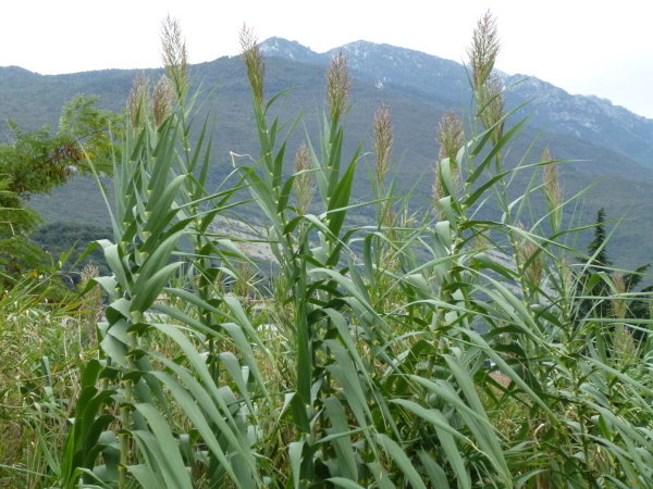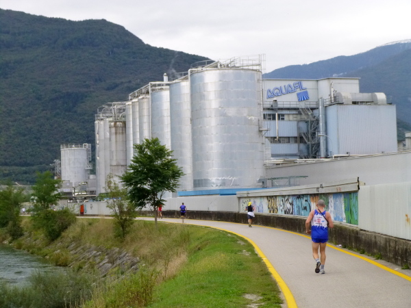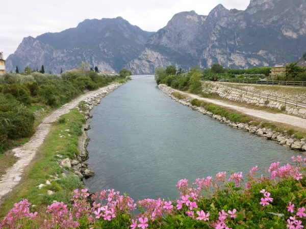 Die Sarca, der einzige größere Zufluss des Gardasees, ist unser ständiger Begleiter bis km 41. Und wieder geht es geradeaus, immer dem Weg auf dem Hochufer der Sarca folgend. Inmitten des Grün passieren wir die weitläufigen Fabrikationsanlagen des Kunstfaserherstellers Aquafil. Wie ein Ungetüm wirkt das silbrig glänzende Gewirr aus Kesseln, Rohren, Schornsteinen. Aber kaum ein Laut dringt von dort nach außen. Gleich danach ist wieder „Natur pur“ angesagt. Zu unserer Linken fließt gemächlich die bisweilen dschungelartig zugewuchte Sarca, zu unserer Rechten ziehen Felder mit Rebstöcken und Obstbäumen vorbei. Besonders schön ist eine Passage mit beidseitig des Weges wucherndem Oleander. Diese Oleanderallee würde ich gerne mal zur Blütezeit erleben.