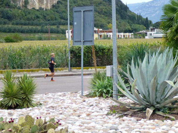 Schnurgerade, kilometerlang und bretteben ist die Asphaltstraße, die uns vom Ufer jetzt in Richtung Arco wegführt. Bis zum Horizont zieht sie sich hin und von dort weiter und weiter ... . Obstplantagen und Rebstöcke säumen unseren Weg, dazwischen verstreut liegen ein paar Gehöfte. Hohe Berge umzingeln die weite Ebene. Eigentlich eine schöne Landschaft, aber eben kein Vergleich zu der bisherigen grandiosen Szenerie. Meditatives Laufen ist das Gebot der Stunde. Wäre es zumindest, denn meine Beine signalisieren mir, dass sie selbst dies als Überforderung empfinden.