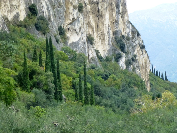 Auf einem parallel zur Uferstraße verlaufenden Weg schieben wir uns an der senkrechten Felswand mit spektakulären Blicken auf die hinter, vor und neben uns liegende Bergwelt vorbei. Vor allem der Kontrast zu den selbst hier Raum greifenden Zypressen und Pinien ist ungemein fotogen. Unser Weg mündet in einen sorgsam mit mediterranen Gewächsen bepflanzten Uferpark, der uns direkt hinführt zum herrlich gelegenen im Weiß der zahllosen Bootsrümpfe erstrahlenden Yachthafen Rivas.