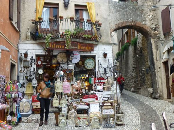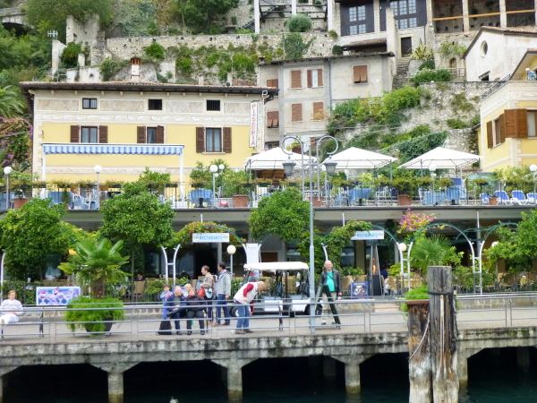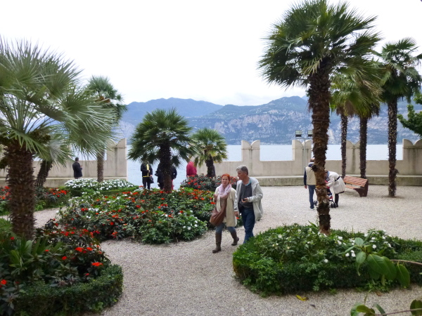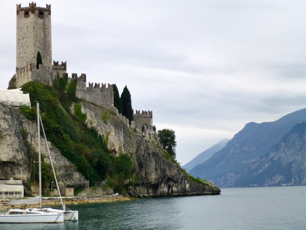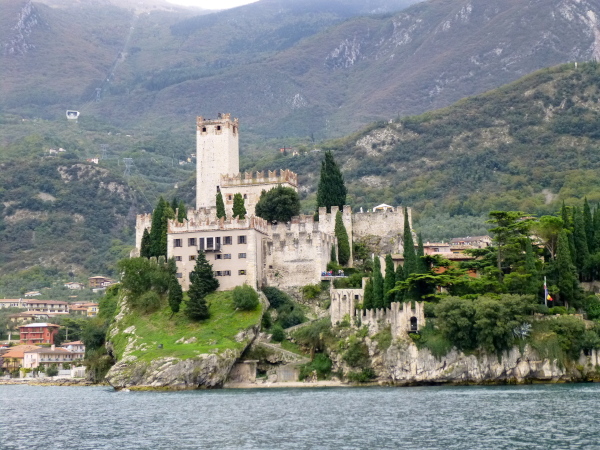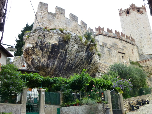 In die Altstadt Malcesines tauchen wir zwar nicht ein, sondern schrammen auf der Gardesana nur vorbei. Doch auch von hier hinterlässt die sich hoch über den Fels erhebende Burg einen nachhaltigen Eindruck. Wie keine andere Familiendynastie hat sich das Veroneser Adelsgeschlecht der Scaliger im 13. und 14 Jh. um den Gardasee herum durch zahlreiche Wehrbauten mit charakteristisch gezackten Zinnen auf Türmen und Mauern verewigt. Die Burg von Malcesine ist eines der die Zeiten überdauernden Prunkstücke.