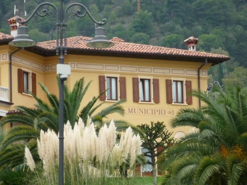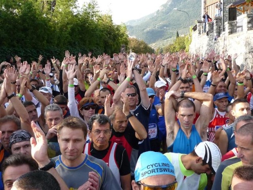 Als ich mich eine Stunde später aufmache, ist der ganze Spuk längst vorbei. Die Altstadt präsentiert sich in beschaulicher Morgenruhe wie eh und je. Nur ab und an verraten ein paar herumirrende folienummantelte Gestalten, dass heute kein normaler Tag ist. Dieser Eindruck ändert sich schlagartig, als ich Via IV Novembre erklommen habe. Lauter Italopop schallt durch die Luft, die Straße zwischen dem Kongresszentrum, wo man seinen Kleiderbeutel mit Wechselkleidung für Malcesine abgeben kann, und dem zweihundert Meter entfernten Startbogen, der auf Höhe des hübschen Stadtparks mit dem Rathaus, der Villa Borghi, gespannt ist, ist voller erwartungsfroher Menschen. Die Stimmung ist wie das Wetter: prächtig. Nachdem gestern noch dicker Hochnebel etwas trübe Herbststimmung verbreitet hat, taucht heute die Morgensonne alles in ein warmes, wohliges Licht.