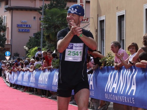 Aber immer noch zwei Kilometer, die Straße steigt etwas an. Mehr und mehr Zuschauer feuern die Marathonis an. Eine kleine Schleife noch, zum See und dann auf rotem Teppich ins Ziel, begleitet vom Applaus der vielen Zuschauer rechts und links der Straße. Italiener sprechen schnell. Der Speaker schafft es, fast alle Finisher namentlich zu nennen. Die Deutschen begrüßt er in ihrer Sprache.
