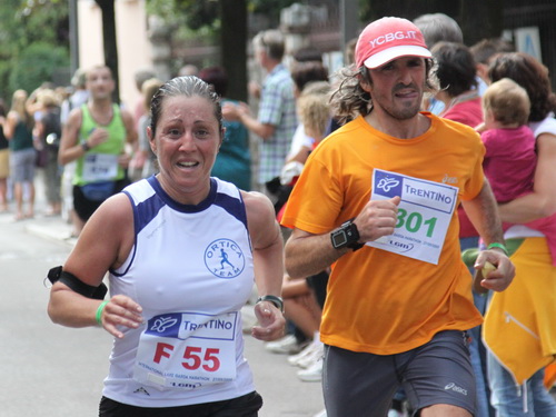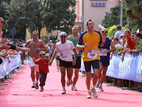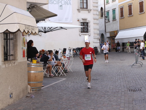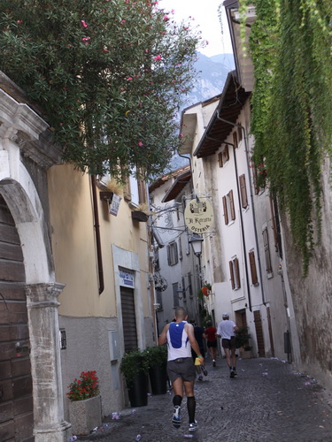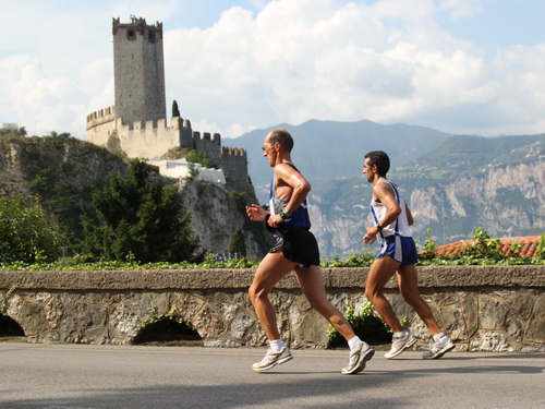 Voraus ist schon Riva zu erkennen, das am Fuß des Monte Brione liegt, der wie eine riesige Steinplatte aus dem See emporragt. Mit viel Schwung, weil leicht abwärts, laufen die Marathonis durch ein Spalier von Zuschauern am Hafen vorbei direkt auf den Torre Apponale zu. Der 34 Meter hohe Uhrturm aus dem Jahre 1220 gehörte einmal zur ersten Befestigungsanlage. Man kann ihn besteigen und hat dann einen schönen Rundblick. Viel bejubelt geht es durch eine schmale Einkaufsstraße und zur Rocca di Riva, der ganz von Wasser umgebenen Stadtburg, die ihr heutiges Erscheinungsbild im 16. und 17. Jahrhundert erhielt.