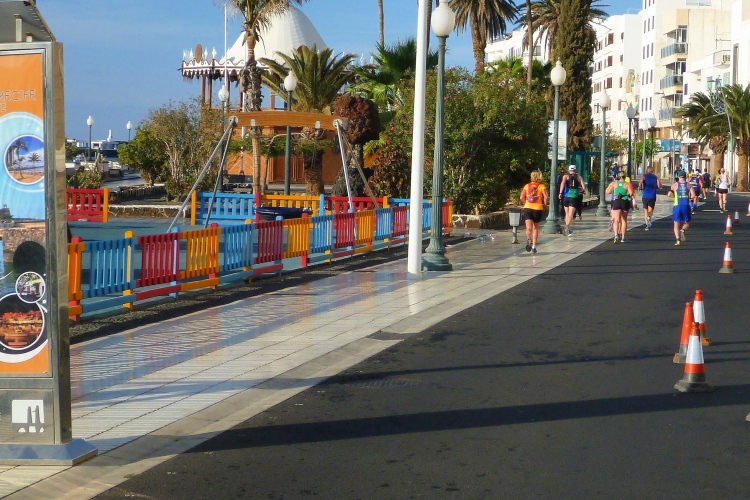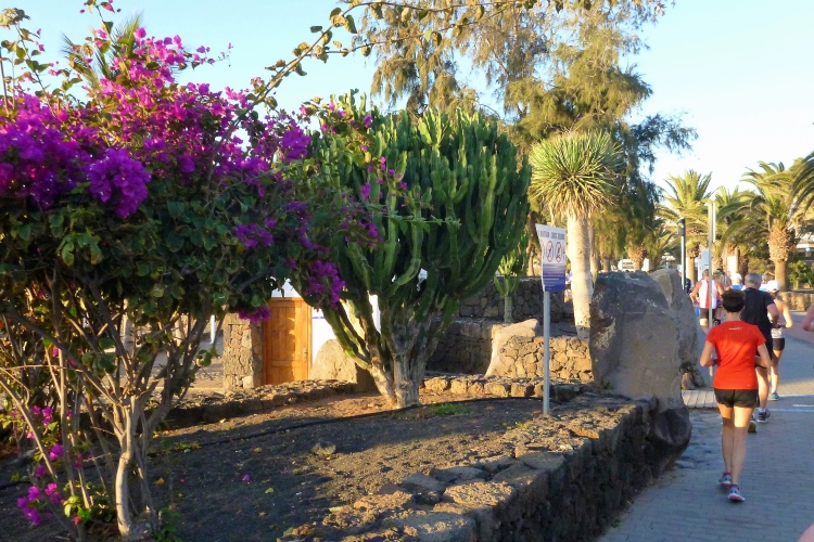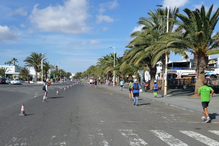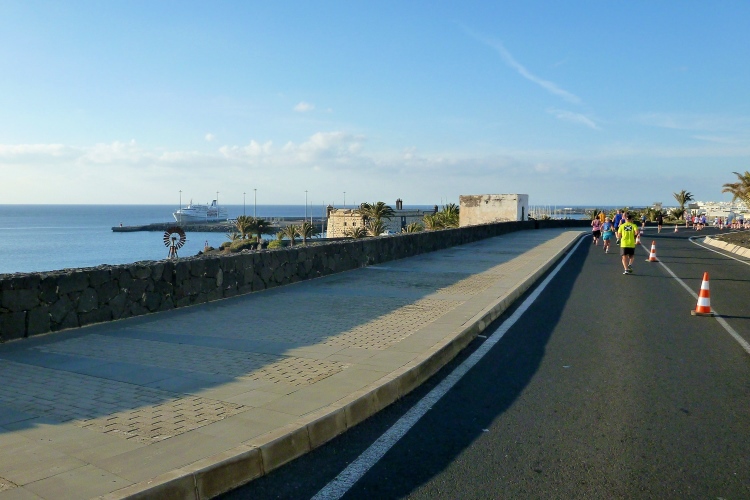 Marina Colón ist der nächste kleine Stadtteil. Dann noch ein paar Schlenker und wellige Abschnitte und wir erreichen Playa Honda. Ein bevorzugter Wohnort der Lanzarotiner. Wirklich schön ist es hier: einige alte Fischerhütten, nette Lokale. Die Aufbauarbeiten sind in vollem Gange. Ein Rollstuhlfahrer kommt uns hier schon entgegen. Viele blaue Hütchen säumen den Weg. Soll man rechts davon laufen? Oder wird so die Laufstrecke von den nun vermehrt auftauchenden Touristen und Radlern abgetrennt? Egal.