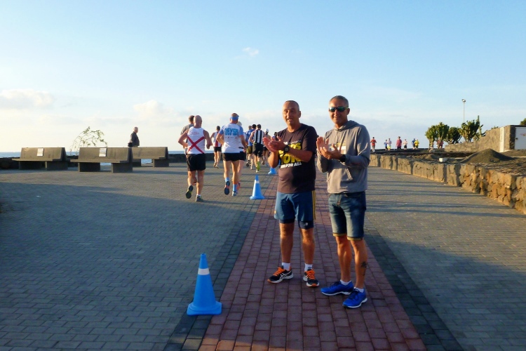 Nach dem Yachtklub öffnet sich der Blick auf das wunderschöne Halbrund des Sandstrands Playa del Reducto. Goldgelber Sand. Am Stadthotel Lancelot Playa eine große Schar von begeisterten Zuschauern. Von hier an geht es nun nur noch über die Küstenpromenade weiter Richtung Westen. Die jungen Helfer an den Verpflegungsstellen sind topmotiviert und feuern jeden Läufer mit viel Spaß an. Besonders hübsch sind die kleinen Wasserflaschen mit ihren farbigen Deckeln. Die Helfer haben diese schon geöffnet.