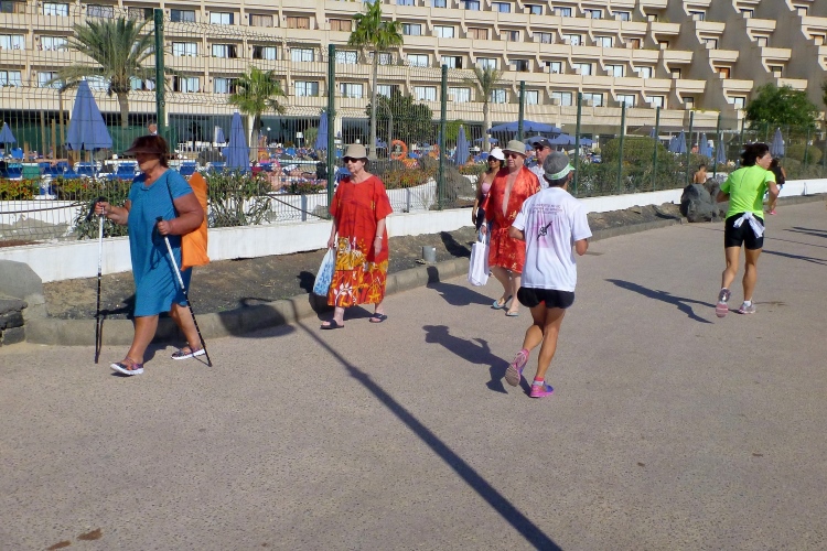 In Playa Honda ist jetzt mehr los. Die Kneipen und Lokale füllen sich langsam. Der schönste Teil des Ortes ist sicher die Strandpromenade. Und dann kommen diese kleinen Hügelchen, die sich zu Bergen aufbauen. Aber: „Never give up“ steht in großen Lettern auf der Rückseite des Lanzarote-Marathonhemds. Das verpflichtet zum Durchhalten. Von der nächsten Erhebung kann man auf einem Strandabschnitt eine Gruppe sehen, die hier ein ordentliches Gymnastikprogramm absolviert. Der 4:15-Stunden-Mann samt Anhängerschaft zieht langsam vorbei. Judith hält noch länger mit, ich falle zurück. Noch mal eine kleine Häusergruppe, dann geht es auf die breite Promenade Richtung Arrecife. Am VP 35 spielt eine Musikgruppe in farbenfrohen Gewändern heimische Weisen. Die Spitze an der Playa del Reducto ist erreicht. Das Hochhaus zum Greifen nahe, von dort sind es noch 11 Kilometer. Unter einem Zeltdach spielen ältere Herren Karten. Einige Touristen sind auf Sightseeing-Tour, feuern uns an. Günther überholt mich.