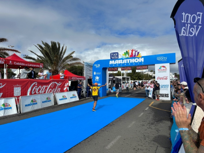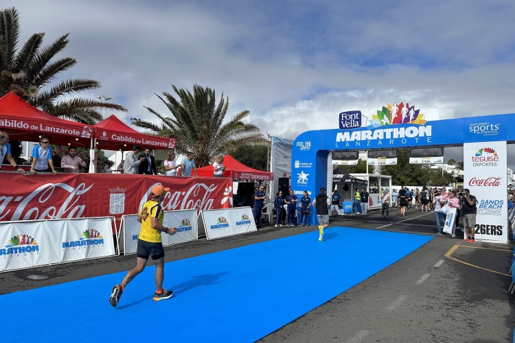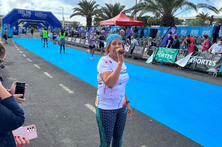 Der nette Zieleinlauf über blauen Teppich – der Untergrund weckt zarte Erinnerungen an Valencia – ist der würdige Abschluß einer schönen Veranstaltung. Die fette Medaille mit lanzarotischen Motiven hebt die Stimmung weiter, die üppige Zielverpflegung tut ihr Übriges.