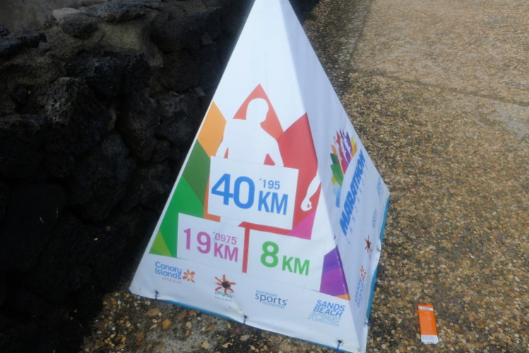 Am Samstag bietet unsere Anlage in Costa del Carmen ein vollständiges Frühstück ab 6 Uhr an, sodaß ich mit dem Auto schnell und rechtzeitig erneut am Startort bin. Es erwarten mich auf der 21,1 km-Wendepunktstrecke zwischen Costa Teguise und Costa del Carmen weitestgehend Wasser und Strand. Das hilft mir, ein Verlaufen zu vermeiden, was aber angesichts der Heerscharen Helfer vollkommen unmöglich ist.