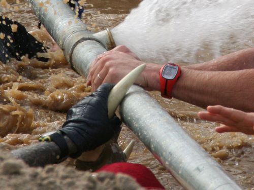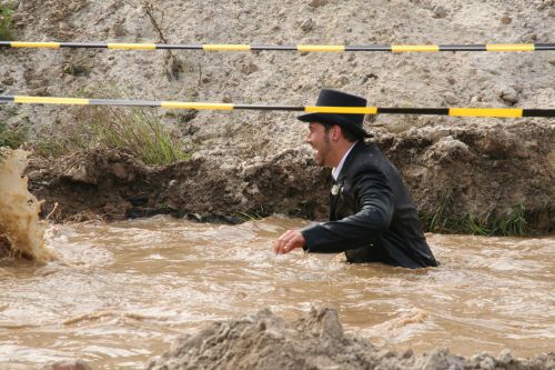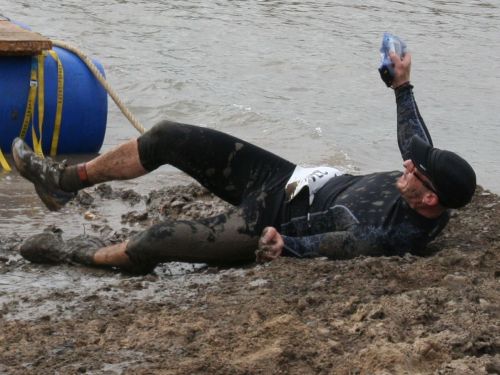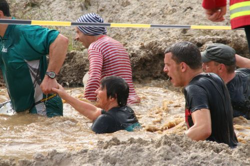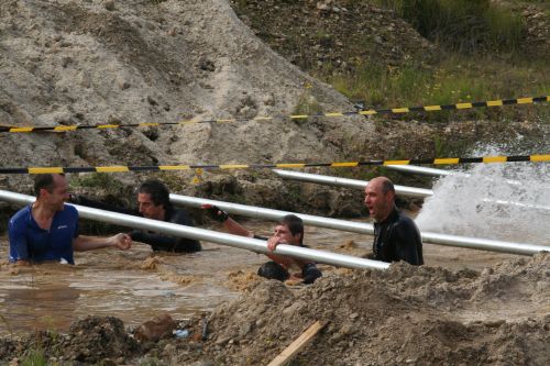 Die drei Burschen in ihren Anzügen sind schon vom Tauchgang gezeichnet und haben intensiven körperlichen Kontakt mit dem Schlamm. Da lohnt sich doch die Reinigung nachher. Einem Teilnehmer mit Schweinchennase gefällt das Feuchtgebiet so sehr, dass er das Hindernis gleich zweimal bewältigt. Beim ersten Male war er wohl zu sauber geblieben.