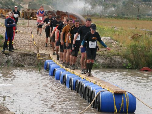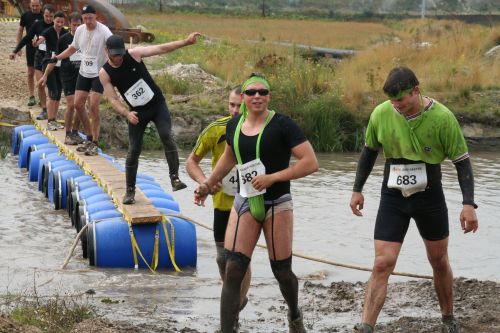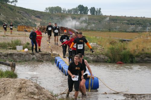 Es geht’s an Feuer und Flamme vorbei. Erneut wirds feucht. Im „Feuchtgebiet“ müssen die Teilnehmer über schwankende Pontons balancieren und das „rettende Ufer“ erreichen. Ohne Wasser- und Schlammberührung geht’s nicht ab. Herrliche Szenen sind zu sehen.