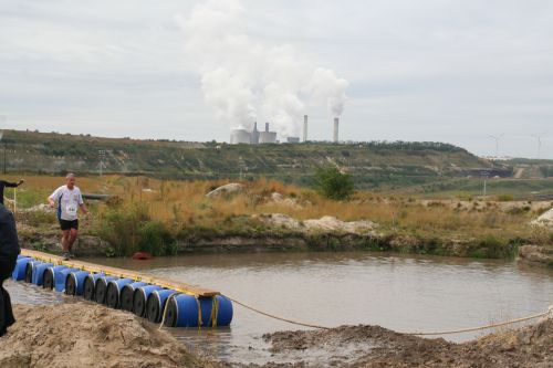 Mittlerweile haben die Läufer den Tagebau verlassen. Auf dem Weg zum nächsten Hindernis laufen sie entlang einer Straße mit tollem Blick hinein in den Tagebau. Es ist schon beeindruckend in das Gelände des Tagebaus zu schauen. 1.700 Fußballplätze hätten Platz im Tagebau.
