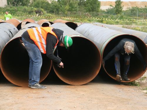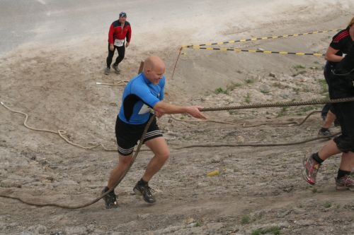 Als nächstes Hindernis sehe ich das Tauziehen. Einen Berg geht’s an Tauen rauf und runter. Ist aber alles machbar. Das gilt auch für die folgenden Röhren. Hatte der Landrat noch vor seinem Startschuss gescherzt, er laufe nicht mit, weil er nicht durch die Röhren passe, so bewältigen auch hier alle Teilnehmer das Hindernis.