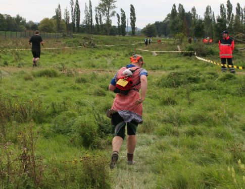 Das nächste Hindernis bietet Vergnügen pur. Der Tauchgang ist extrem feucht, hier bleibt nichts trocken. Es spielen sich schöne Szenen ab, jeder nimmts mit viel Humor. Einige ziehen nach dem Hindernis ihre Laufhemden aus und wringen diese aus. Etwas weniger feucht laufen sie dann weiter. Die Braut ist clever. Der Bräutigam muss durchs Wasser und tauchen, sie nimmt die Außenbahn am Hindernis vorbei.