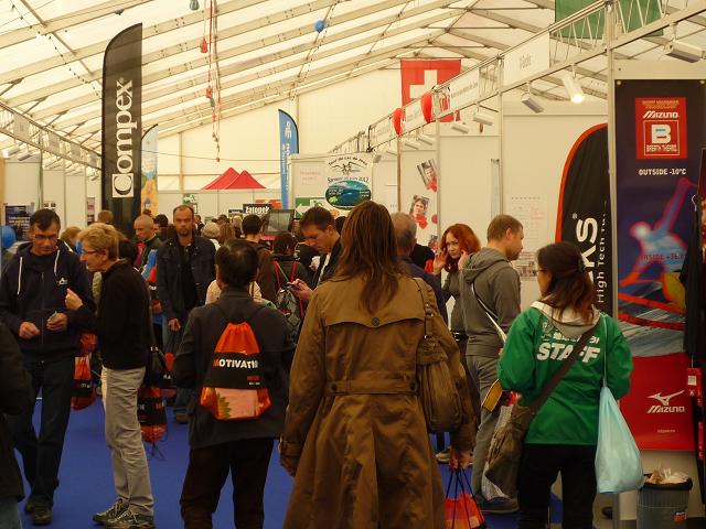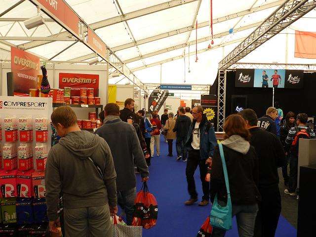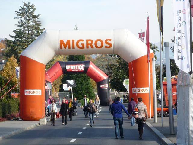 Geschmack beweist der Veranstalter bei der Wahl der Location für die Marathonmesse. Diese findet in exponierter Lage auf der Place de la Navigation, direkt am Ufer des Genfersee, französich Lac Leman genannt, statt. Der ist, wer hätte das gedacht, mit 581 qkm immerhin der größte mitteleuropäische See, größer als der Bodensee und sehr viel größer als etwa der Gardasse oder der Lago Maggiore. Ein mächtiges Zelt ist hier aufgebaut, dessen zentraler Teil der Ausgabe der Startunterlagen vorbehalten ist. Zumindest am frühen Samstag Nachmittag geht es hier noch sehr gemütlich zu, sodass das Heer von Helfern nicht wirklich gefordert ist. Trotzdem müssen die drei netten älteren Damen an meinem Schalter schon zusammen helfen, um meine Nummer zu finden. In den Gängen um die Nummernausgabe herum drängen sich die Stände der Laufmesse mit kleinem, aber feinem Angebot.