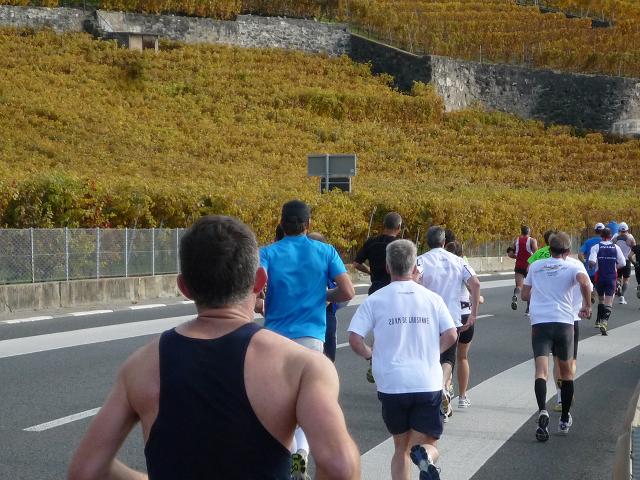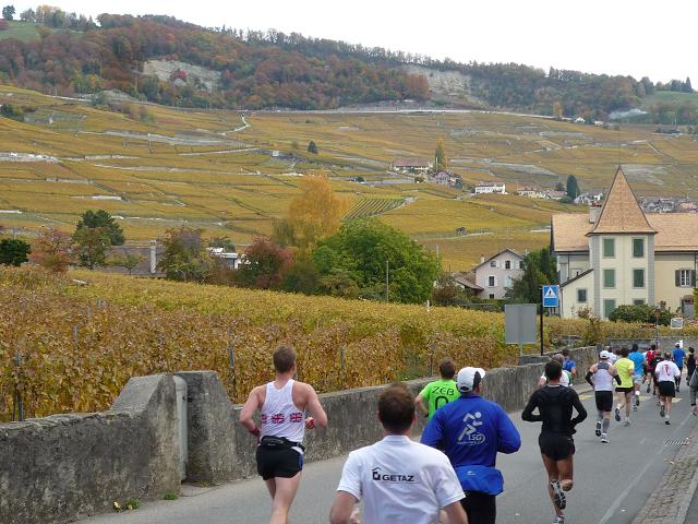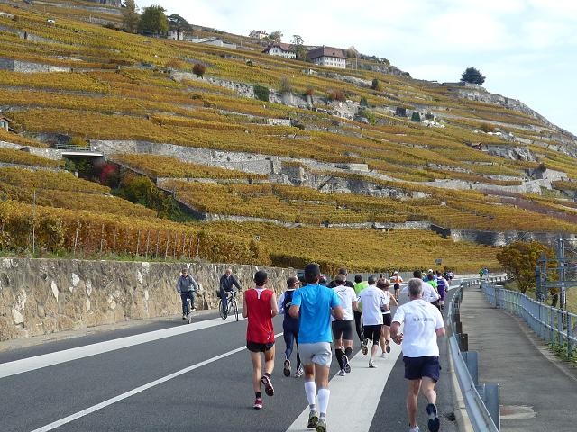 Hinter Cully beginnt der attraktivste Teil unseres Streckenkurses. Wir folgen hier der durch das Herz des Lavaux führenden Panoramastraße. Zu unserer Linken ziehen sich, soweit das Auge reicht, die in herbstlichen Gelb-Rot-Braun-Tönen eingefärbten Weinberge die Hügel hinauf. Zu unserer Rechten erstreckt sich unter uns der weite glitzernde See, am Horizont von den schemenhaften Bergen der Sovoyer Alpen umrahmt. Und wir laufen mitten hindurch. Nichts stört diese so puristische, wie wundervolle Kulisse.