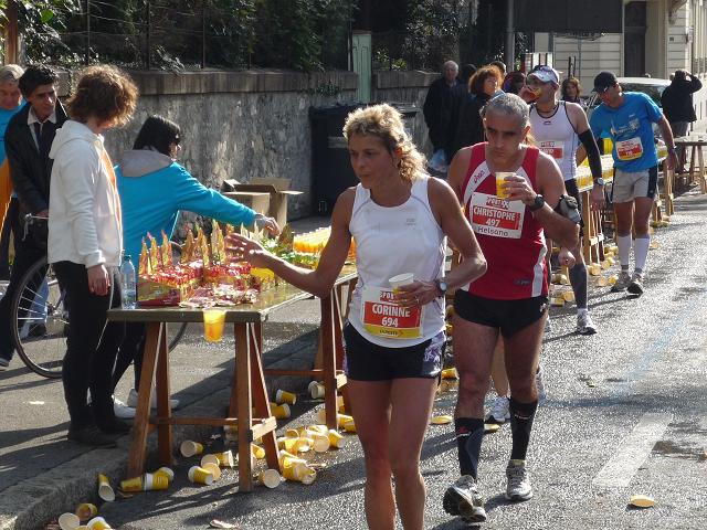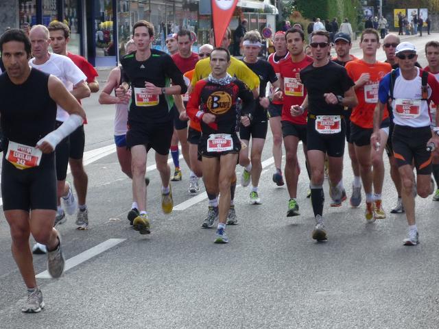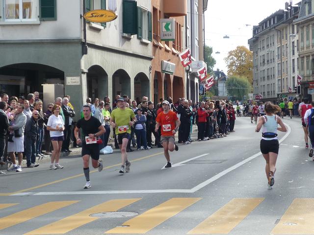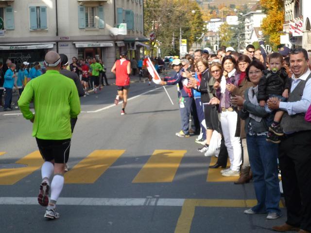 Auf breiter Straße geht es weiter in die Stadt hinein. Vereinzelt kommen mir auf der Gegenspur nun schnellere Läufer entgegen. Zunächst irritiert bin ich, dass es nicht die ostafrikanischen Spitzenläufer sind. Des Rätsels Lösung: Die habe ich wohl auf meinem Weg durch Corseaux, wo Hin- und Rückstrecke (ausnahmsweise) nicht deckungsgleich sind, verpasst. Dafür darf ich wenig später die motorradeskortierten Spitzenläuferinnen, natürlich auch aus Ostafrika, in Augenschein nehmen.
