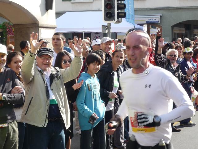 Im Ortszentrum ist, noch mehr als in Vevey, der „Bär los“. Hochstimmung herrscht unter den dichten Trauben der wartenden Zuschauer, die klatschend und laut johlend jeden Einzelnen der Vorüberziehenden anfeuern. Die Begeisterung steckt an. Angeheizt wird die Stimmung durch die Klänge einer Liveband. „Knockin‘ on heaven‘s door“ spielen sie gerade, als ich vorbei komme. Wie meinen die denn das? Nun ja, eigentlich fühle ich mich noch ganz gut.