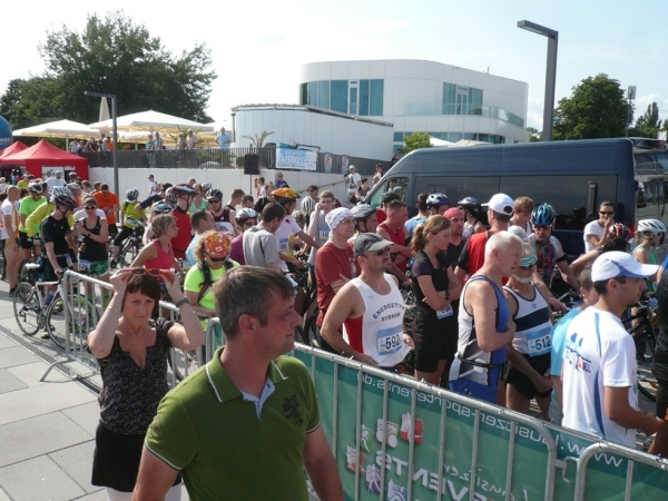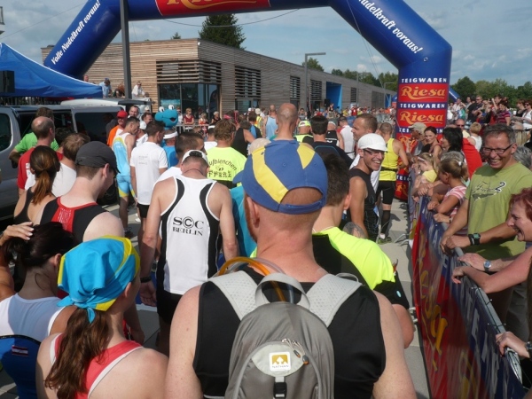 Erst kurz vor dem Start verlassen die Teilnehmer ihren schattigen Platz und kommen zum Startbogen, der in der prallen Sonne steht.