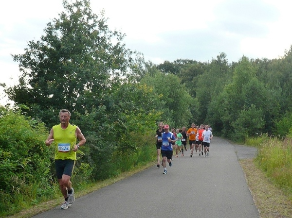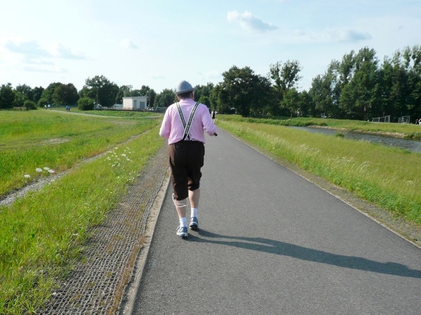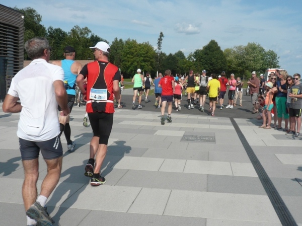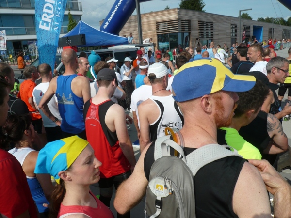 Wir sind gerade 500m gelaufen, da kommen die etwas später gestarteten Radfahrer an uns vorbei bzw. zickzack durch die Läufer, total undiszipliniert, um nicht zu sagen rücksichtslos. Und völlig unnötig, denn nach 1-2km ist das Feld so weit auseinander gezogen, dass die Biker ganz entspannt ihre Run-Partner finden können. Da sollte man beim nächsten Mal was ändern.