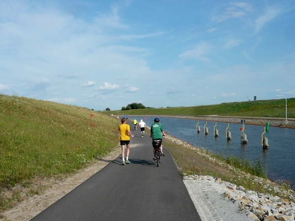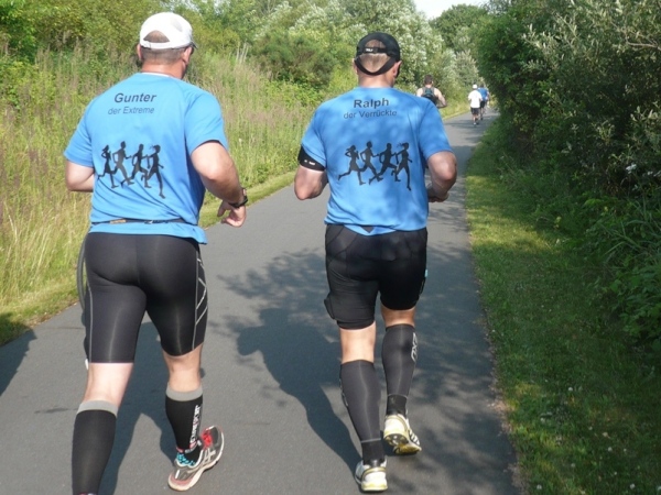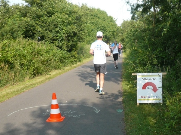 Zwischen dem km 13 und 14 überqueren wir den Rosendorfer Kanal, der die zwei Seen verbindet. Noch bevor wir Lieske erreichen, heißt es für die Marathonis rechts ab in eine Extrawendeschleife. Am Abzweig gibt es eine weitere Versorgungsstation. Jetzt kommen mir schon viele Run & Bike Teams und Marathonläufer entgegen und so habe ich die Gelegenheit, wieder ein paar Läuferbilder zu schießen. Und jetzt entdecke ich auch ein bekanntes Gesicht. Es ist Klaus Egedesø vom 100 MC Dänemark, den ich Wilhelmshaven Marathon her kenne.