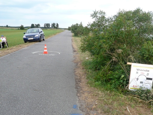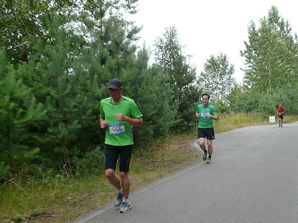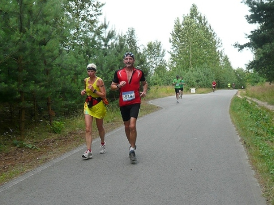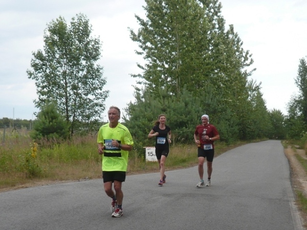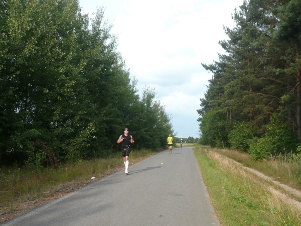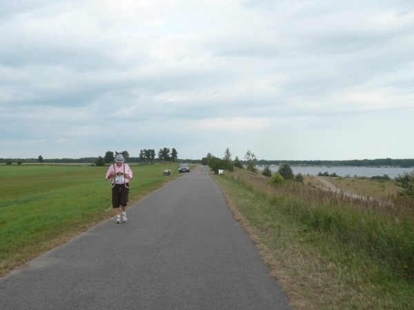 Und dann kommt mir „Der Bayer“ entgegen, er ist der Vorletzte und hat schon 1km Vorsprung. Es geht leicht wellig am Ufer des Partwitzer Sees entlang. An der Schutzhütte überqueren wir die Landesgrenze nach Sachsen. Kurz dahinter ist der Wendepunkt. Zur Kontrolle werden die Startnummern notiert. Dann geht es zurück am Versorgungspunkt vorbei nach Lieske.