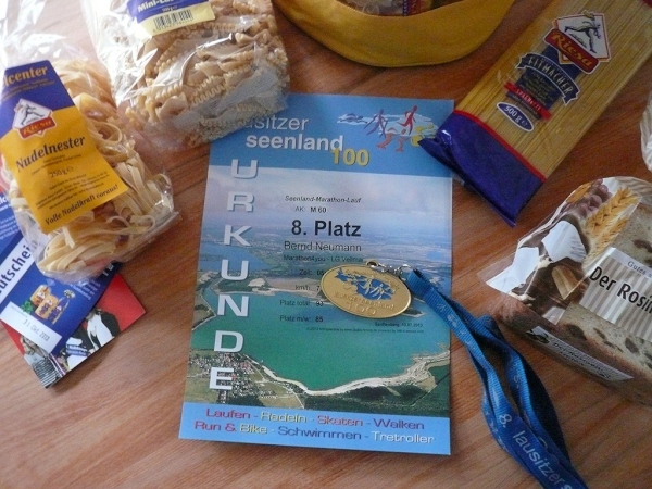 Ich bekomme meine Medaille und einen Rucksack, voll mit Nudeln und Rosinenbrot, und auch noch meine Urkunde.