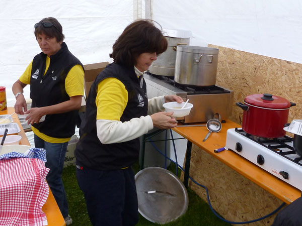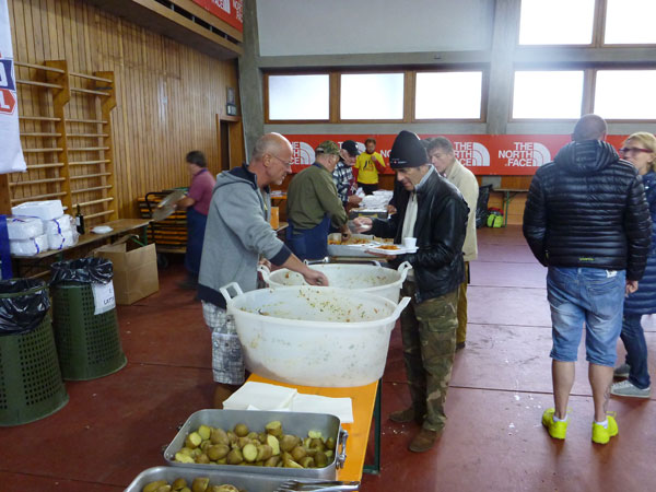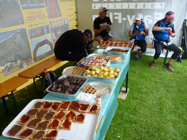 Im Ortszentrum ist eine lange Gerade für den Zieleinlauf abgesperrt. Viele Zuschauer haben sich eingefunden und jubeln uns zu. Eine Finisherweste á la UTMB gibt es nach Abgabe des Zeitmesschips noch als Draufgabe. Im 500 m entfernten Gymnasium gibt es noch den ganzen Abend die Möglichkeit, verbrannte Kohlenhydrate zu ersetzen. Pasta, Kartoffeln, Bohnen, Gulasch und Getränke werden angeboten. Ein Gutschein dafür war ebenfalls in den Startunterlagen.