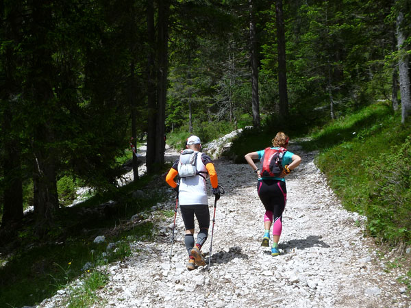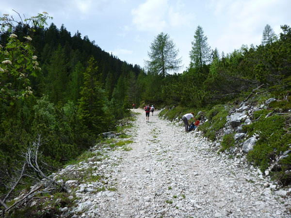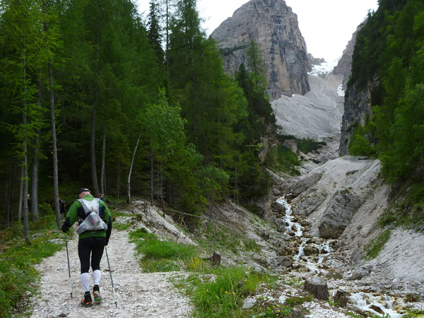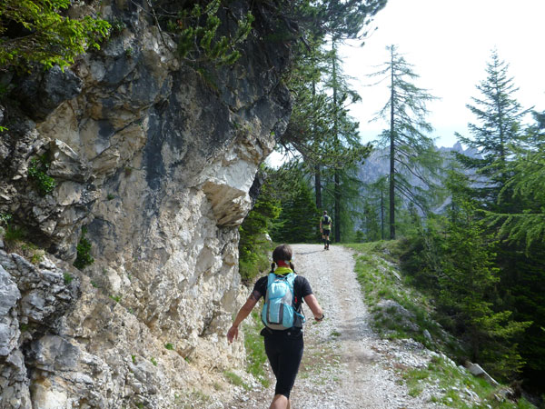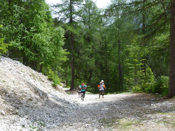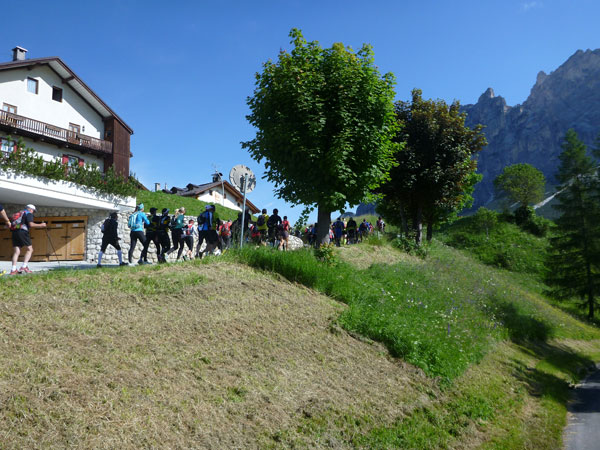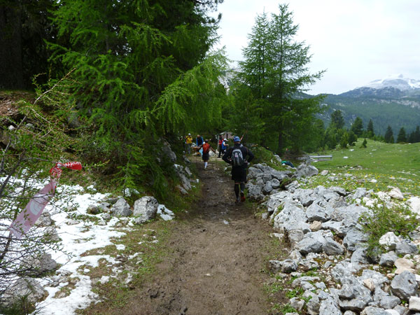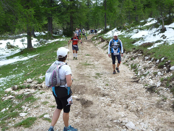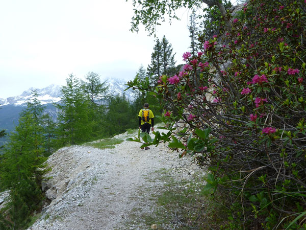 Direkt nach der VP ist die Abzweigung, die unseren Kurs vom Lavaredo trennt. Während wir die Abkürzung nehmen, geht es für die Ultras auf eine Schleife Richtung Drei Zinnen. Flach geht es für uns vorerst für die nächsten 3 km weiter, bevor der steile Anstieg zum Forcella Lerosa beginnt. 500 Höhenmeter beinhaltet der 5 km lange Aufstieg zum höchsten Punkt unseres heutigen Tages auf 2.000 m. Erste Schneereste begleiten uns seitlich des Weges auf dem letzten Teil des Anstieges, das meiste ist auf dieser Höhe aber bereits wieder geschmolzen.