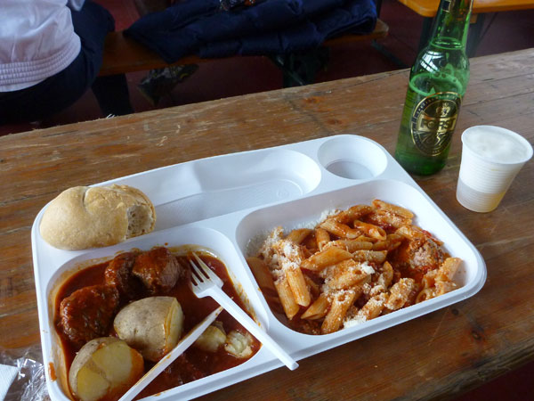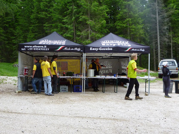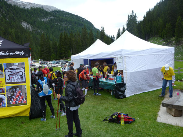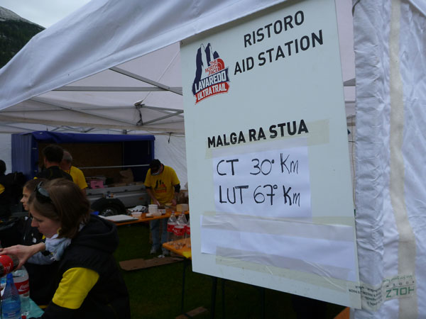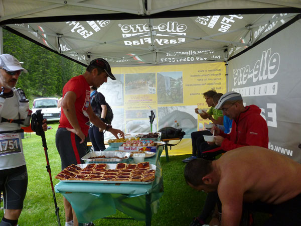 In zwanzig Minuten bin ich wieder auf halbem Wege herunter. In der Mitte eines langen Tals, an der Grenze zum Naturpark Fanes-Sennes-Prags ist an der Alpe Ra Stua VP2 (km 30) errichtet. Die Läufer des LUT haben hier bereits 67 km auf ihrem Tacho. Verteilt auf mehrere Zelte kann hier richtig geschlemmt werden. Für mich ein unbedingtes Muss bei langen Trails. Ich nehme mir sehr viel Zeit um diverse Leckereien durchzuprobieren. Deftige italienische Salami, würziger Käse, Nutella-Panini, Nudelsuppe, Kuchen, Schokolade und und und, alles ist dabei, es bleiben kaum Wünsche offen. Ja, natürlich, auch wieder „Forst“.