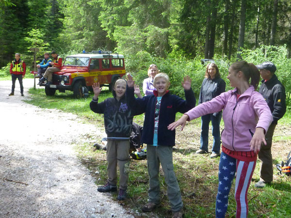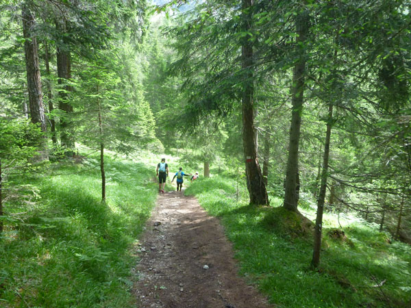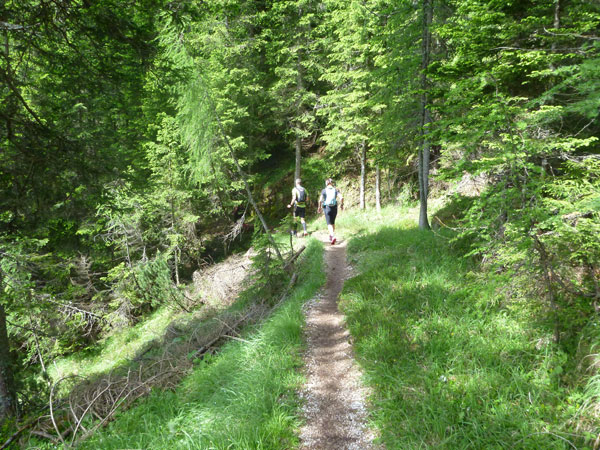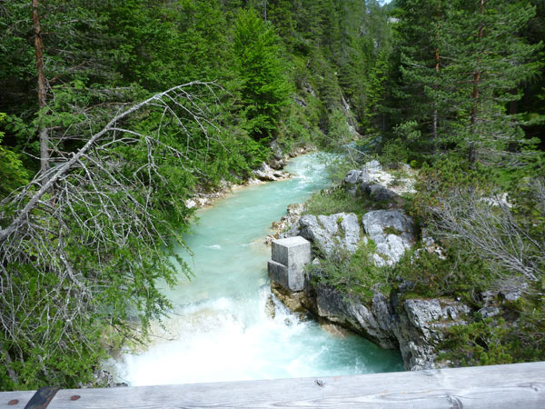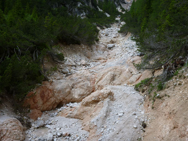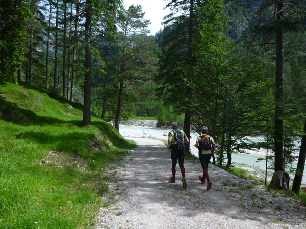 Ein wunderbarer Single-Trail auf weichem Waldboden führt uns in Serpentinen wieder hinunter bis zum Flussbett des Boite, der hier oben entspringt und auf seinem 46 km langen Weg durchs Boite-Tal nach Cortina fließt. Für uns gilt es jetzt ein paar relativ ebene Kilometer auf Forstwegen bis zur ersten Verpflegungsstation bei km 18 zu absolvieren. Für mich gibt es ein Bierchen zum Frühschoppen. Das schön gekühlte italienische „Forst“ lässt sich wirklich gut trinken im Sonnenschein.