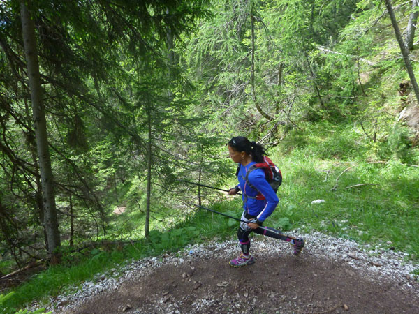 Der Ablauf ins Tal beinhaltet etwa 7 km Downhill, dabei sind 600 hm negativ zu bewältigen. Auf bequemen Waldwegen geht es in vielen Serpentinen abwärts. Das Gefälle ist nicht übermäßig steil, so kann gut gelaufen werden. Bei km 44 ist noch einmal eine Getränke- und kleine Verpflegungsstation aufgebaut. Unmittelbar danach muss auch eine Zeitmessmatte passiert werden.