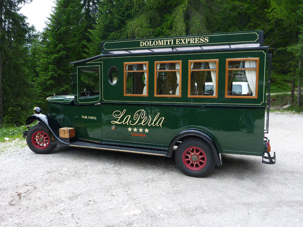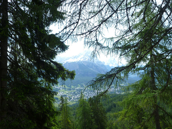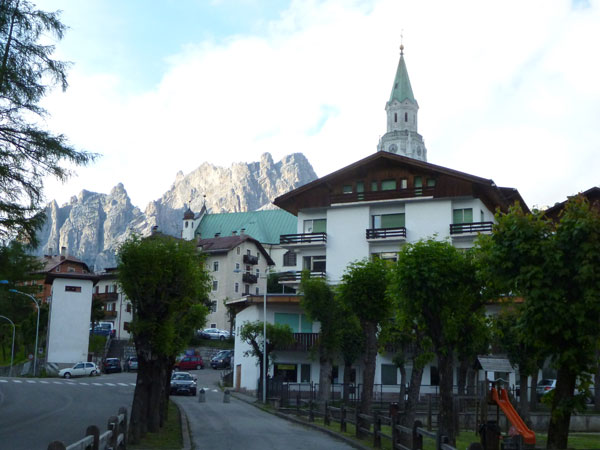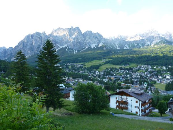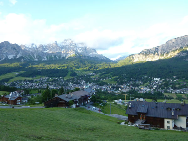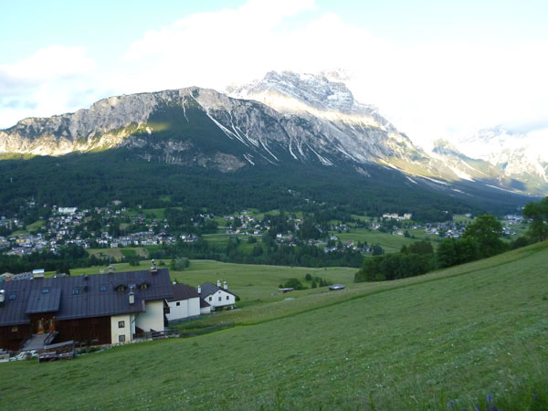 Über Brenner und Autobahnausfahrt Brixen erreiche ich Cortina d‘Ampezzo. Der Ort liegt auf einer Höhe von 1.200 Metern im herrlich gelegenen Valle del Boite und wird nicht umsonst als Königin der Dolomiten bezeichnet. Über den Köpfen thronen majestätisch die über 3000 m hohen Gipfel der Tofana di Mezzo, Monte Cristallo und Sorapis. Bereits die Einfahrt in die Talmulde ist eine echte Schau. Besonders empfehlenswert für Nichtläufer, oder jemand der nicht sonst irgendwie hinauf kraxeln will, ist ein kleiner Ausflug mit dem Kfz hinauf, Richtung Valzarego Pass. 2 – 3 Kilometer genügen, der wunderbare Anblick von Cortina von oben lohnt sich. Bevorzugt vor Sonnenuntergang.