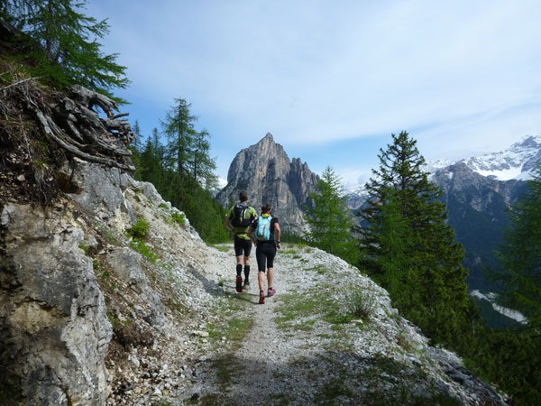 Nach etwa 36 Kilometern erreiche ich die Aussicht in eines der schönsten Bergtäler der Dolomiten: das Travenanzestal – ein Supercanyon ohne Gegenstück in den Dolomiten. Eingehauen zwischen den Wandfluchten der Tofana- und Fanisgruppe, durchtost von den Wassermassen des Travenanzesbaches bietet sich uns ein überwältigendes Naturerlebnis. Fast wäre ich achtlos daran vorbei gelaufen, aber einige Hinweistafeln ließen mich doch neugierig werden. Ein kleiner Abstieg durch ein paar Bäume an den Rand der Schlucht beschert mir einen großartigen Ausblick weit hinein in den wilden, naturbelassenen Canyon. Es sind genau diese Augenblicke und Entdeckungen, die mich am Trailrunning so begeistern.