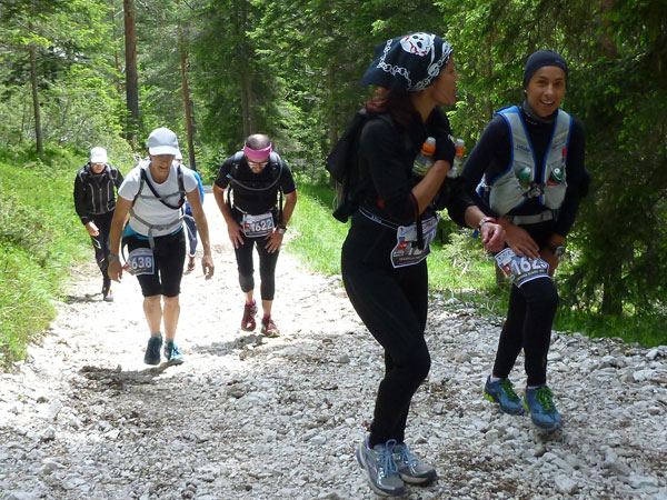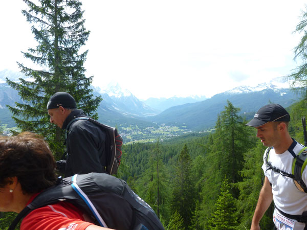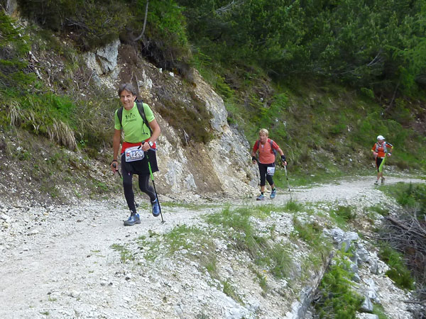 Abschnittsweise brutal steil führt der Weg seitlich hinauf Richtung Tofana. Hier werde ich jetzt des Öfteren von den Verfolgern des LUT-Führenden überholt. Die Burschen sind super drauf, laufen noch leichtfüßig in kleinen Trippelschritten auf dem Vorfuß nach oben, obwohl sie bereits über 70 km hinter sich haben. Nur an ganz besonders steilen Abschnitten gehen sie auch mal für einige Meter. So ergibt sich mir eine wunderbare Studie der Spitzenläufer, ich bin wirklich begeistert. Das oberste, flachere Segment entlang der Felswände sind wir heute Morgen bereits in entgegengesetzter Richtung gelaufen.