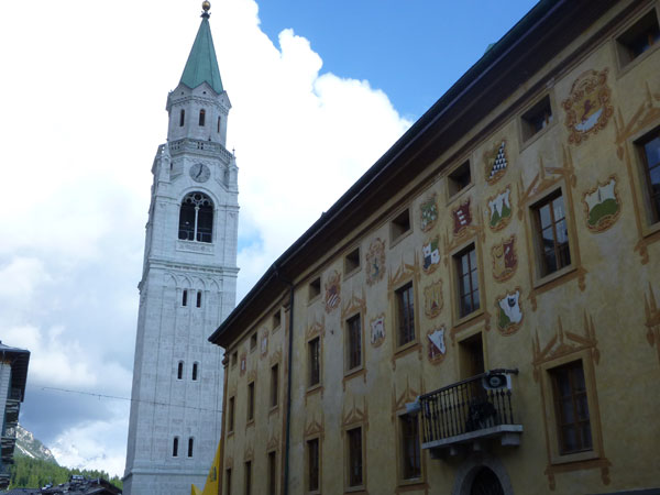 Nicht nur ich, sondern auch viele andere werden ungläubige Blicke am Samstagmorgen in den Himmel gerichtet haben. Er ist strahlendblau mit nur ein paar vereinzelten Wölkchen. Selbst die optimistischsten Wettervorhersagen konnten uns dieses Szenario nicht voraussagen. Alles wird gut. Die Nacht war zwar kalt, aber kurz vor 8 Uhr, beim Start des LUT, sind die Temperaturen bereits wieder in den zweistelligen Bereich geklettert. Gestartet wird im Zentrum von Cortina auf dem Corso Italia. Nicht schwer zu finden, da der Start- und Zielbogen direkt neben der erst vor kurzem aufwendig renovierten Kirche Parrocchiale SS. Filippo e Giacomo und ihrem 70 Meter hohen Turm aus Dolomitblöcken aufgebaut ist. Auf seiner Spitze befindet sich eine vergoldete Kugel mit einem Meter Durchmesser; das markante Geläut der sechs historischen Glocken ertönt mit der Melodie von Big Ben.