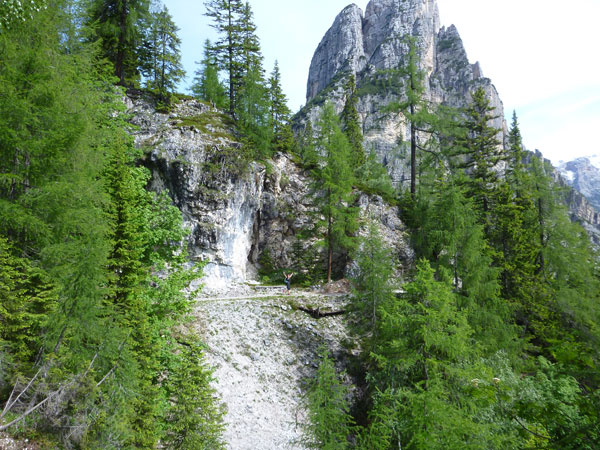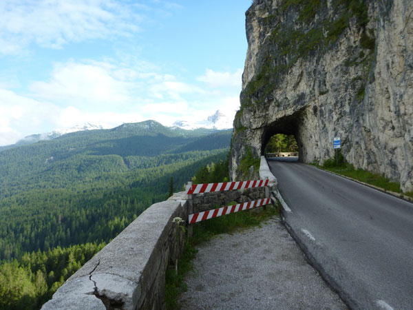 Vorerst geht es aber für uns noch mäßig steigend auf Teerstraßen aus Cortina hinaus. Bis auf 1.800 m führt uns der erste von drei größeren Aufstiegen. Ein längeres Stück winden wir uns an den Felswänden entlang, mit herrlichen Überblicken ins Tal. Als deutsches Trio bin ich auf den ersten Kilometern mit Janina und Carsten unterwegs. Ich hatte ja die Hoffnung, dass wir nach Streichung der Tofane und Richtungsänderung zu den Drei Zinnen, diese als Ersatz zu sehen bekommen. Carsten kennt sich da besser aus und erteilt mir ein klares No. So erklären wir eben alle Felsformationen die eine Ähnlichkeit haben und auch drei Spitzen aufweisen, zu unseren eigenen Tre Cime. Und wir haben einen Riesenspaß damit.