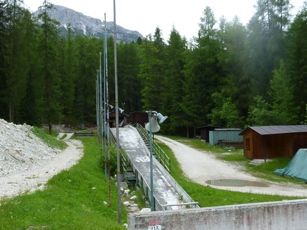 Kurz vor Cortina überqueren wir noch Skipisten, eine Rodelbahn und am Ortseingang die Tofanabahn Freccia nel cielo, zu Deutsch: Himmelspfeil. Über Asphalt führt der Endspurt durch Cortina.