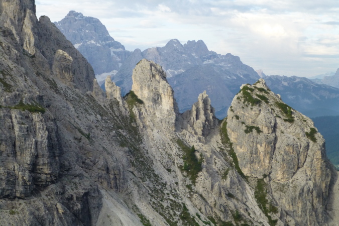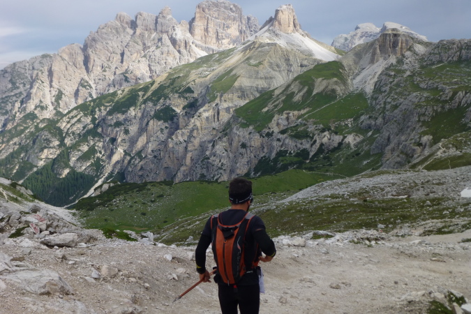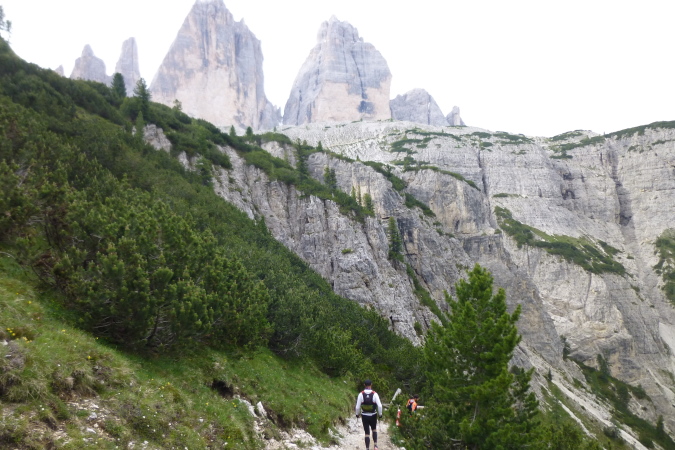 Selbst das Rifugio mit den wilden Gipfeln im Hintergrund erscheint aus der Ferne in einem ganz neuen Bild. Auch die Optik der Drei Zinnen erfährt im Vorbeilaufen eine langsame Wandlung und zieht zunehmend die Aufmerksamkeit auf sich. Immer steiler, immer prägnanter, immer zackiger wirkt der Fels. Aber noch immer nicht sehen wir die Postkartenseite der wohl berühmtesten Felsentürme der Dolomiten, das Nebeneinander der drei monolitischen Felszacken Cima Ovest, Cima Grande und Cima Piccola, deren mittlerer immerhin 2.999 m üNN misst.